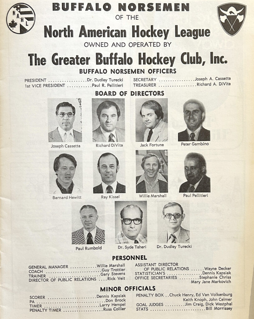 With the rinks finally built in 1975, and an agreement signed with the NAHL, Doctors Turecki and Taheri join eight other local investors to form the “Greater Buffalo Hockey Club, Inc.” This group will oversee the business operations of the newly formed hockey team that will play its home games out of the Tonawanda Sports Center. The group has its work cut out for it: they have only a few short months to get a team together, and to sell it to the ticket-buying, hockey-hungry public.